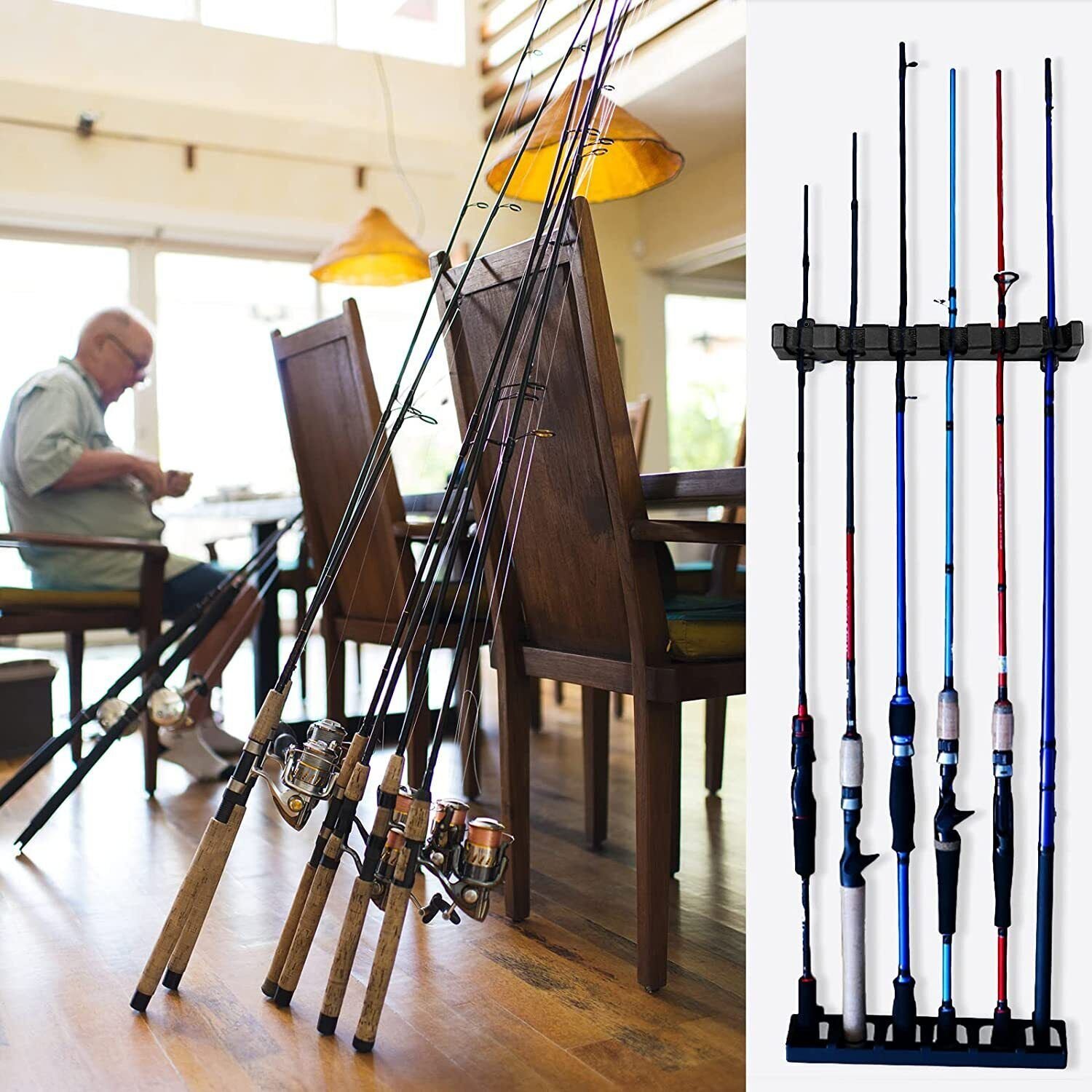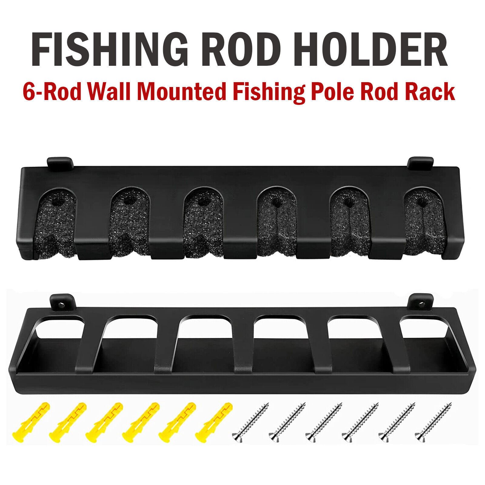 Fishing rod rack safely stores up to 6 rodsFoam grip pads hold rods neatly and securelyPower disk systemDurable yet lightweight plastic designCorrosion proof for long lasting useStores 6 rods neatly and securely foam grip padsSecure Fit: The foam insert in the top holders that holds your poles in place, keep them from falling on the ground. This fishing rod rack is must have for anyone looking to get the fishing rods out of the corner and organized.Durable Bottom Rails: Bottom holder has front support to keep your rods from sliding out. The space between each slot is about 1.5inch.Foam Top-holders: Top slots with 6 high density foam, holds your rods very snugly, just need to push to slide into the foam of the rod holder slot.